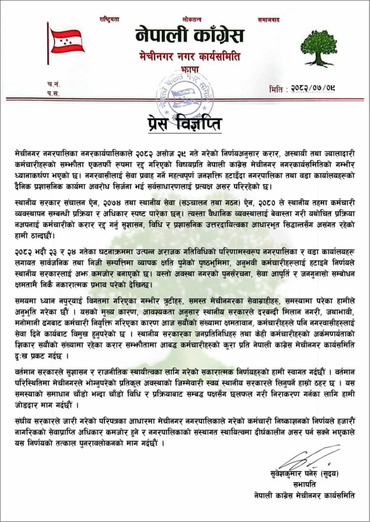 कांग्रेस मेचीनगर सभापति सुदय पनेरूले आइबार प्रेस विज्ञप्ति जारी गरेर कर्मचारी हटाएकाे विराेधमा निर्णय तत्काल पुनरावलोकन गर्न माग गरिएको छ ।