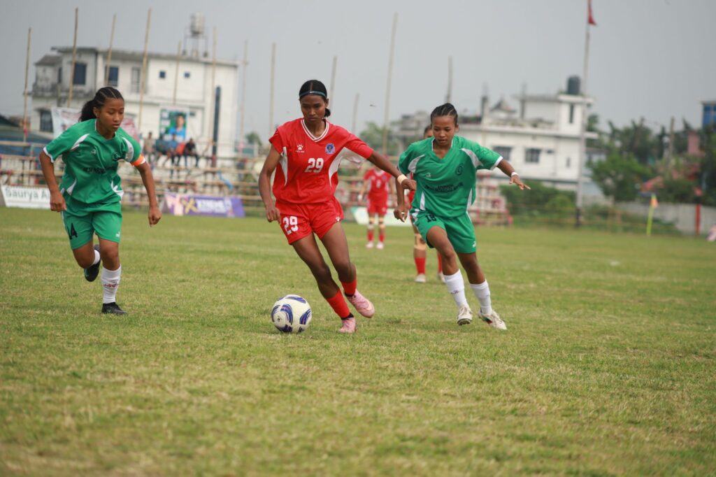 खेलको पहिलो मिनेटमै रेखा पौडेलले गोल गरिन् । डिबक्समा रहेकी पौडेलले अर्की स्ट्राइकर मीना देउवाको हेडरलाई सदुपयोग गर्दै गोल गर्न सफल भइन् ।