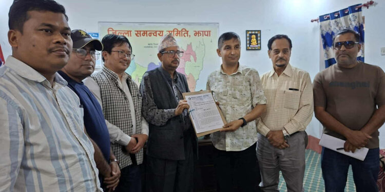 नेपाल पत्रकार महासंघ झापाका अध्यक्ष एकराज गिरीको नेतृत्वमा गएको प्रतिनिधि टोलीले जिल्ला समन्वय समिति झापाका प्रमुख विश्व बराललाई ज्ञापनपत्र बुझाएका थिए ।